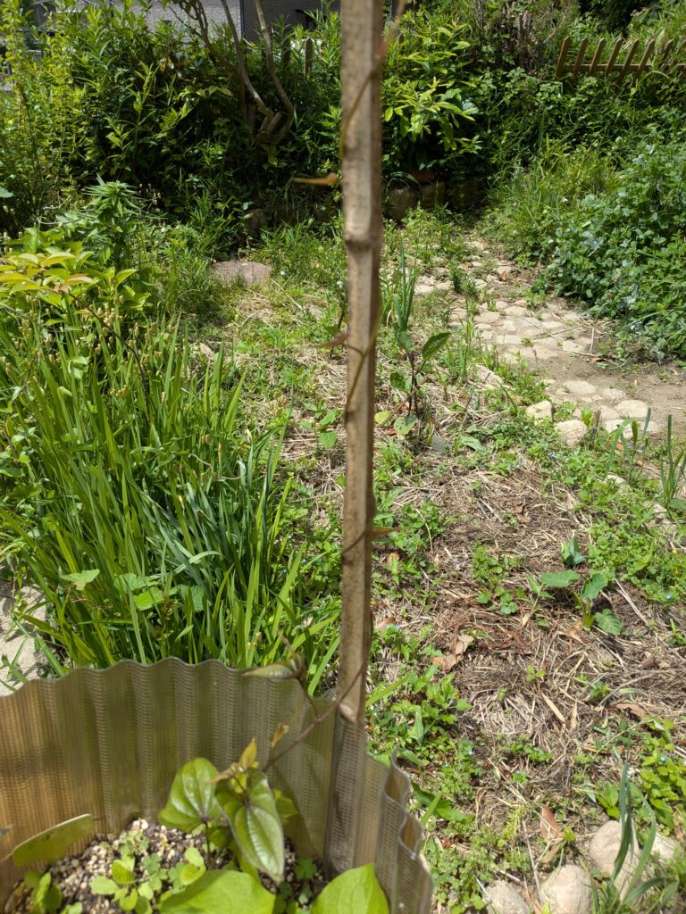 自然薯(のようなもの)から出てきたようなので、ツルを伸ばせるように急遽竹の支柱を設置