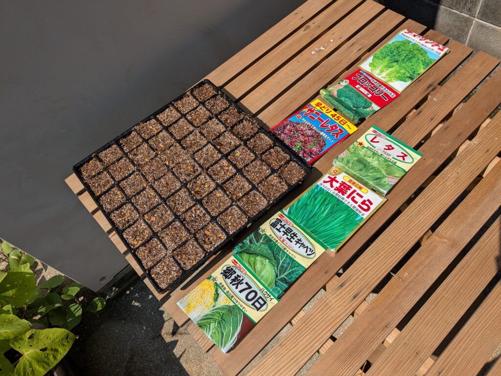 秋冬野菜のうち、大型になるものを中心にポットに種まきし、育苗していきます。