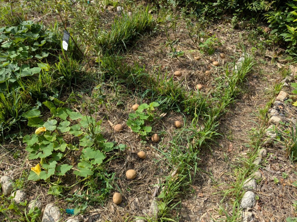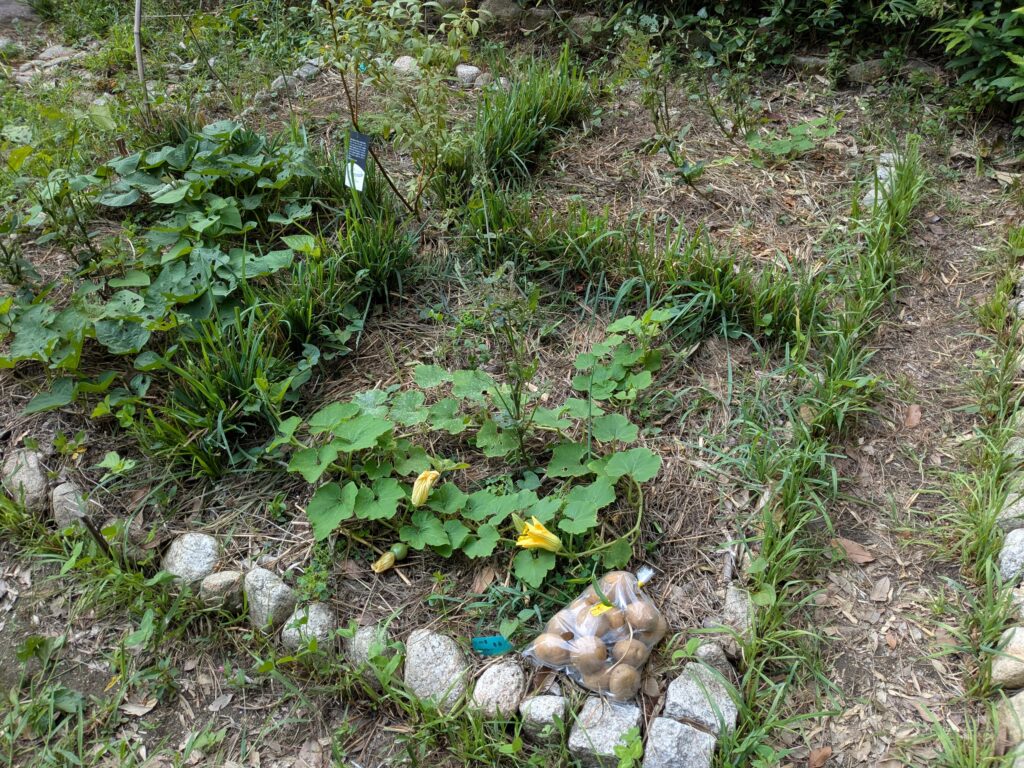 自然菜園 秋ジャガイモの植え付け@畝② 20250818 syu8531 2025年8月18日 / 2025年8月22日 協生農法(シネコポータル) 畝②に秋ジャガイモ(デジマ)の種芋を植え付けました。 計15個入ってました。 芋掘りのときに作業しやすいと考え、かぼちゃが出ているところより通路側(西側)に。 また、8/14(木)にまいた種から少し発芽してきています! 何の芽か分からないのですが・・・ 秋冬野菜で埋め尽くされる予定なのですが、どう成長していってくれるのでしょうか? 楽しみです! ジャガイモ デジマ 畝②